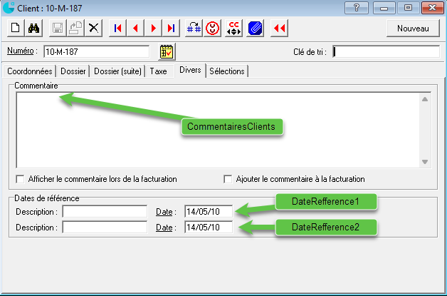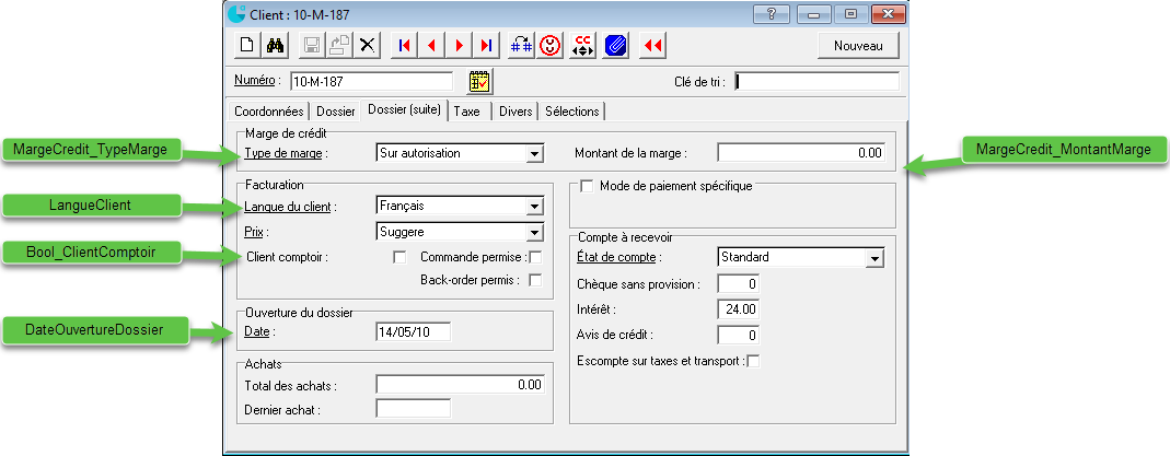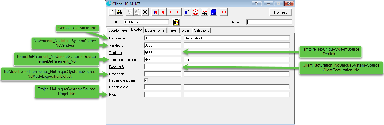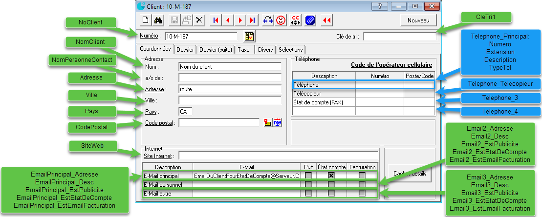 Voici la fenêtre de client en indiquant pour chaque champ son équivalent dans notre modèle de données.