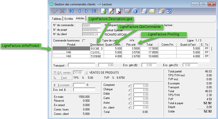 Voici la fenêtre de gestion des commandes en indiquant pour chaque champ son équivalent dans notre modèle de données.