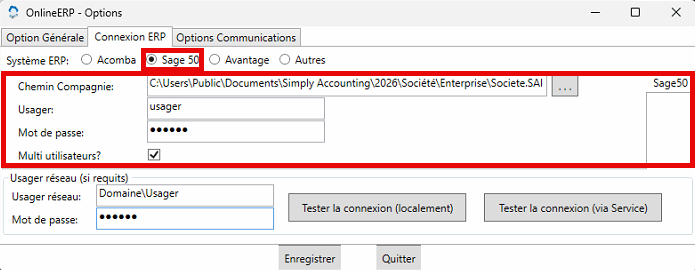 - Usager / Mot de passe : Il s’agit de saisir les identifiants pouvant accéder à Sage50 (ex: Sysadmin, ou bien un usager créé expressément pour le connecteur).