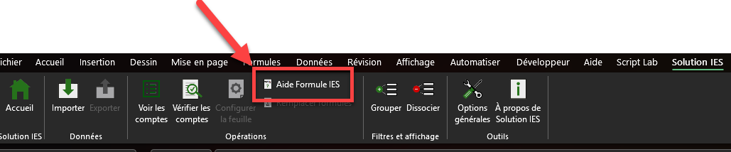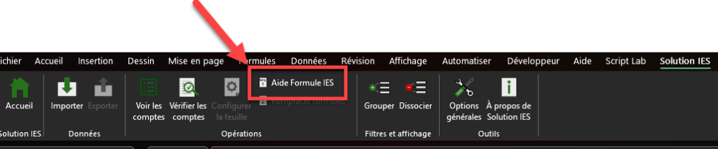 Cliquez sur le bouton “Formula Helper” dans le ruban Solution IES pour accéder à la liste interactive des fonctions avec exemples et descriptions.