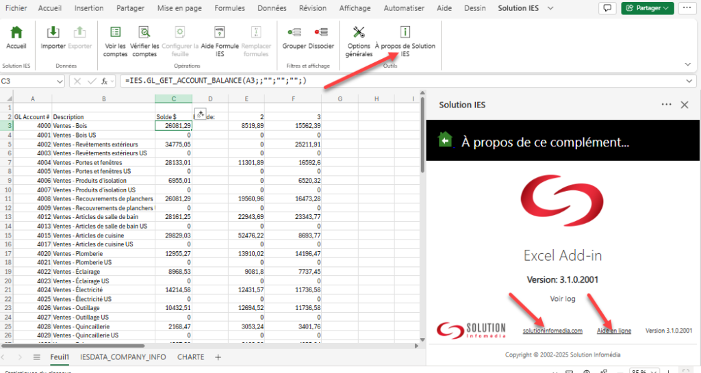 Solde $. En C3, puis dans le panneau IES, allez à “Aide sur les formules” > SoldePériode (IES.GL_GET_ACCOUNT_BALANCE), référez la cellule A3 et validez. - En D2, écrivez