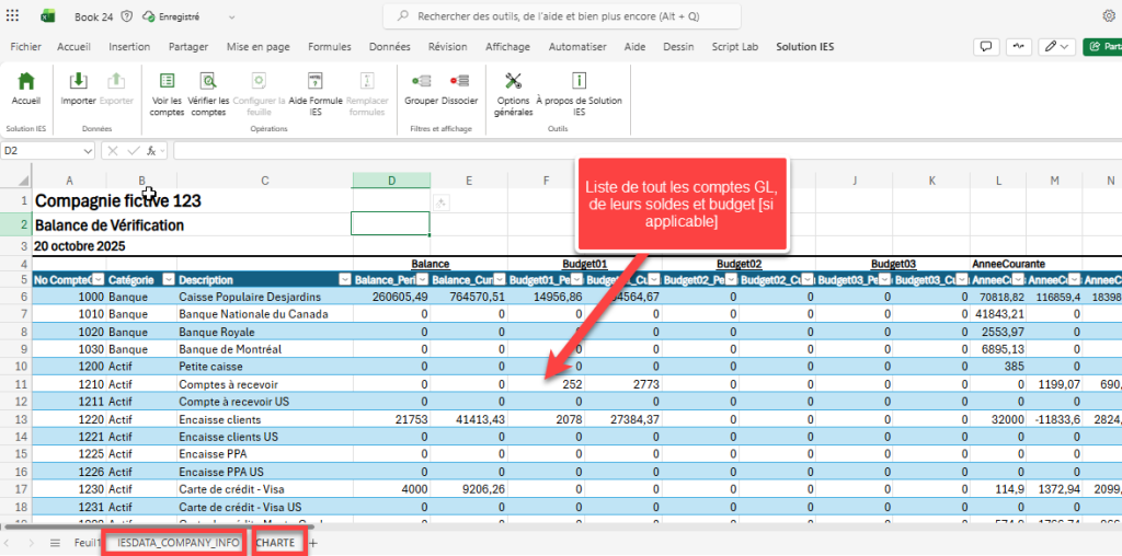 - note : à chaque réimportation de vos données, SolutionIES retourne chercher de l’information à jour, et va écraser les onglets IESDATA_XXX et Charte.