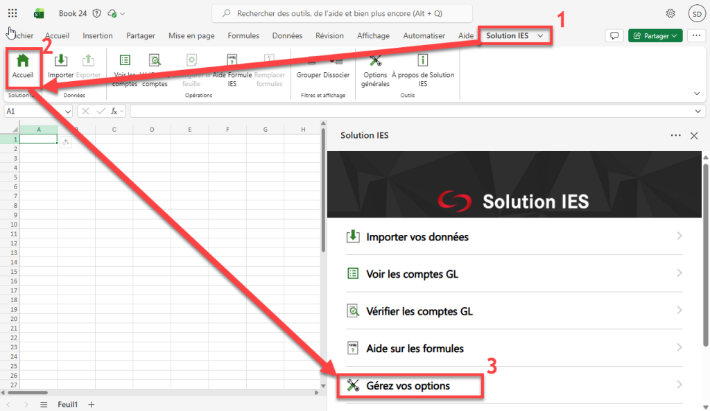 - Dans Excel, ouvrez l’onglet Solution IES (ruban).