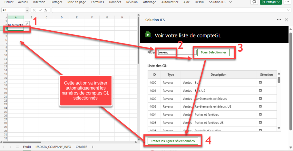 Cette action inscrit automatiquement, dans Excel, la liste des numéros de comptes GL (vous auriez pu les saisir à la main).